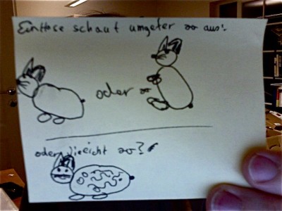 Töchterlein von und zu Naseweis (gemeinhin als “k2” bekannt) hatte mein Hasenoriginal auf dem Schreibtischchaoswust gefunden und für nicht gut befunden: “Mama, was soll das denn sein?” - “Äh, ein Hase ...?!” - “Die sehen doch aber ganz anders aus ...”. Sprach’s und griff zu Papier und Stift: